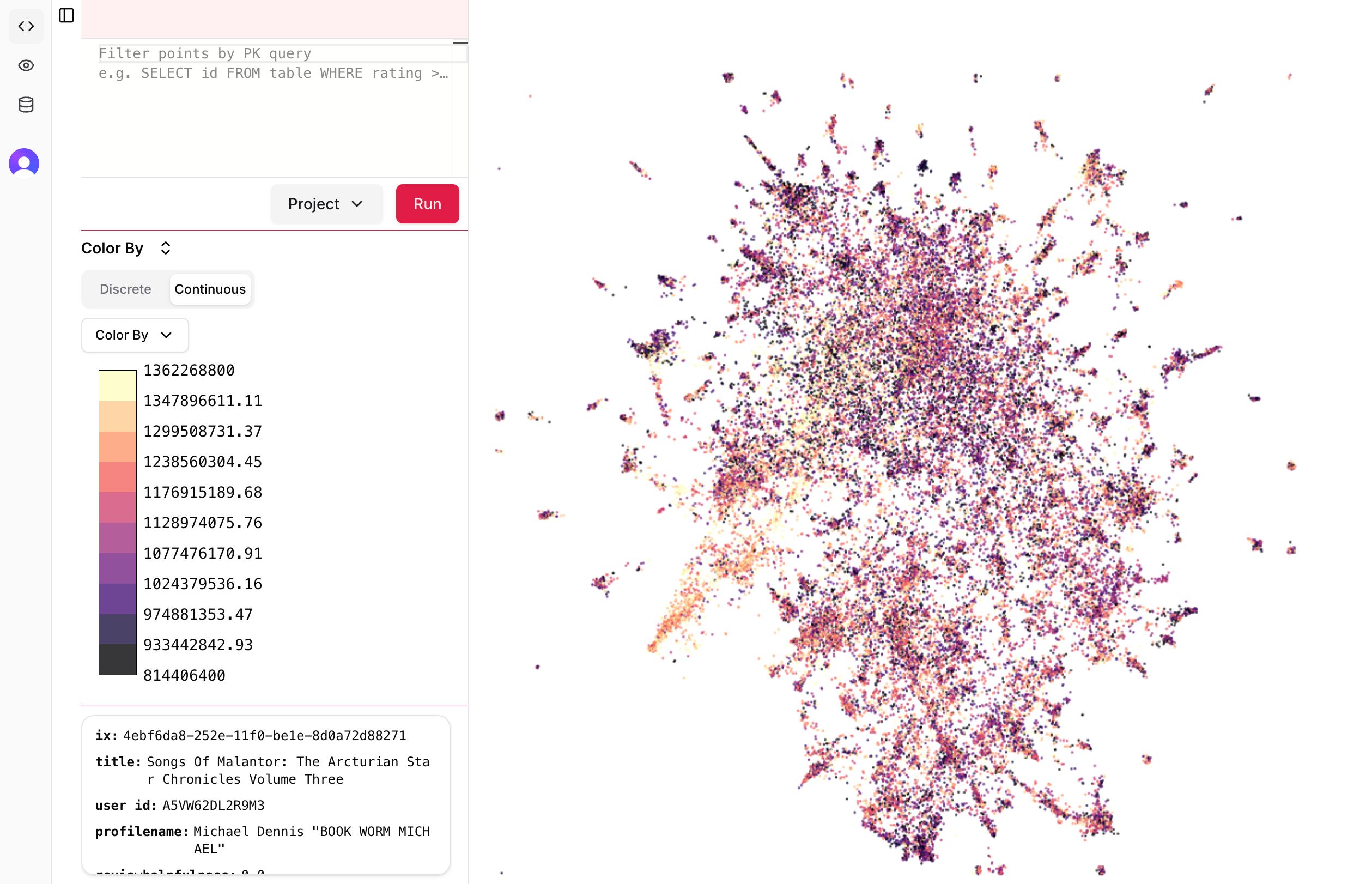Create a projection of a table. Our secure cloud worker pulls the selected table with the read-only string, runs dimensionality reduction on the Vector column and adds the 2D coordinates, then stores the snapshot as Apache Arrow files.